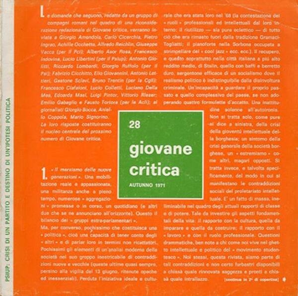93 p. ; 22 x 22 cm. «Giovane critica» venne pubblicata tra il dicembre/gennaio 1963/64) e l'estate 1973 come rivista di cinema, prodotta dal Centro universitario cinematografico di Catania. Dopo una prima fase, allarga il proprio arco di interessi, seguendo un percorso simile a quello di molte altre riviste culturali degli anni sessanta. Vi collaborano Sciascia, Strada, Chiaretti, Paris, Cases, Giammanco, Amodio, Asor Rosa, Merli, Masi, Fofi. Alla critica cinematografica si sommano nel tempo quella letteraria e teatrale con l'aggiunta dell’analisi del costume, del dibattito culturale in senso lato, della critica di fondo al neocapitalismo, alla società dei consumi, e, conseguentemente, alle stesse forze politiche dominanti. Senza mai aderire alle formazioni organizzate della sinistra rivoluzionaria e anzi criticandole, soprattutto per il rifiuto di fare i conti con Stalin, la rivista leggerà con grande partecipazione la rivoluzione culturale cinese e tenterà di forzarla in chiave antiburocratica e come unica alternativa alle posizioni sovietiche. Direttore e factotum della rivista è l'intellettuale Giovanni Mughini. La redazione inizialmente a Catania venne spostata nel 1971 a Roma quando come editore subentrò Musolino di Torino per poi essere successivamente sostituito da Sapere edizioni di Milano. La periodicità iniziale fu bimestrale poi dal 1966 trimestrale con irregolarità. Brossura editoriale, coperta in cartoncino flessibile colorato (arancio e verde) plastificato lucido. Qualche segno del tempo alla coperta, per il resto esemplare integro. Codice libreria 6603.