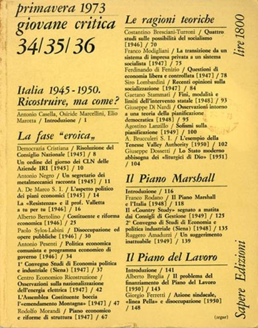 176 p. ; 21 x 17 cm. «Giovane critica» venne pubblicata tra il dicembre/gennaio 1963/64) e l'estate 1973 come rivista di cinema, prodotta dal Centro universitario cinematografico di Catania. Dopo una prima fase, allarga il proprio arco di interessi, seguendo un percorso simile a quello di molte altre riviste culturali degli anni sessanta. Vi collaborano Sciascia, Strada, Chiaretti, Paris, Cases, Giammanco, Amodio, Asor Rosa, Merli, Masi, Fofi. Alla critica cinematografica si sommano nel tempo quella letteraria e teatrale con l'aggiunta dell’analisi del costume, del dibattito culturale in senso lato, della critica di fondo al neocapitalismo, alla società dei consumi, e, conseguentemente, alle stesse forze politiche dominanti. Senza mai aderire alle formazioni organizzate della sinistra rivoluzionaria e anzi criticandole, soprattutto per il rifiuto di fare i conti con Stalin, la rivista leggerà con grande partecipazione la rivoluzione culturale cinese e tenterà di forzarla in chiave antiburocratica e come unica alternativa alle posizioni sovietiche. Direttore e factotum della rivista è l'intellettuale Giovanni Mughini. La redazione inizialmente a Catania venne spostata nel 1971 a Roma quando come editore subentrò Musolino di Torino per poi essere successivamente sostituito da Sapere edizioni di Milano. La periodicità iniziale fu bimestrale poi dal 1966 trimestrale con irregolarità. Brossura editoriale, coperta in cartoncino flessibile colorato (giallo chiaro). Codice libreria 5886.
