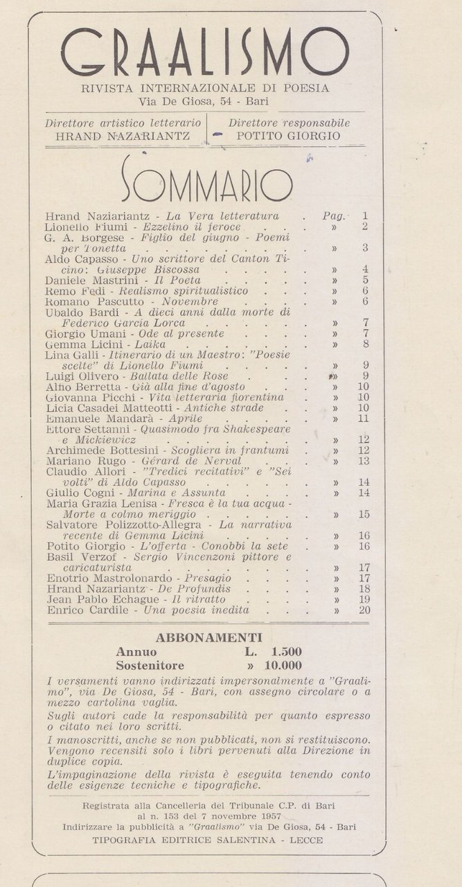 GRAALISMO anno I n 1 gennaio 1958 autografo Hrand Nazariantz rivista poesia Bari