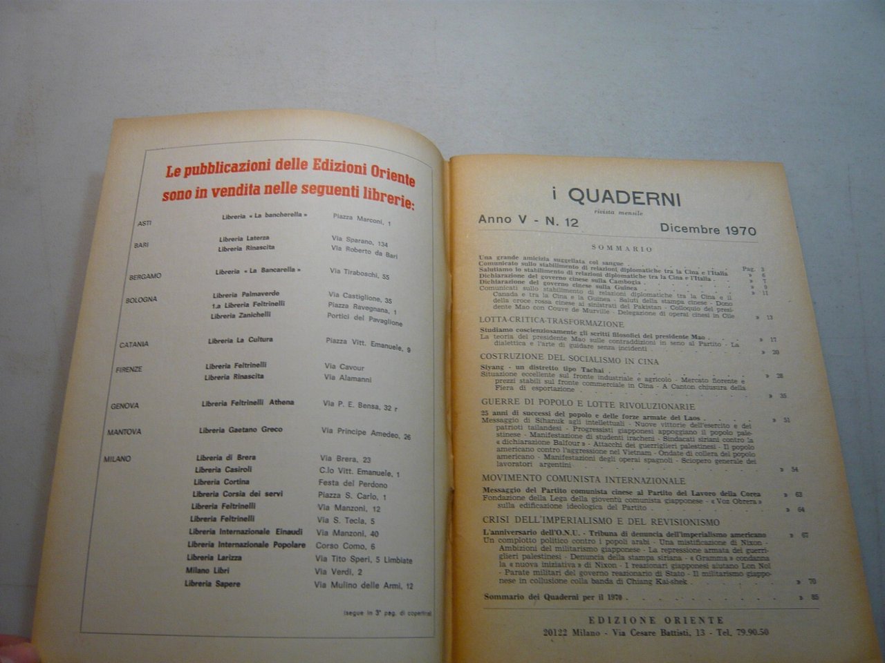 I QUADERNIdella stampa cineseEdizioni Oriente, MilanoBrossura, 24x17cm Peso a rivista: g. 108 circacod. 60334 fascicoli:ANNO III 1968N.1N.2ANNO IV 1969N.1ANNO V 1970N.3N.5N.9-10N.12ANNO VI 1971N.3N.5N.6N.7-8N.10ANNO VII 1972N.7-8N.10N.11-12 ANNO VIII 1973N.8-9ANNO IX 1974N.3N.4N.5N.6-7N.10N.11N.12ANNO X 1975N.1ANNO IX 1976N.11ANNO XII 1977N.1N.7-8N.9ANNO XIII 1978N.1N.2N.5N.8N.9CONDIZIONI DELLE RIVISTE:I fascicoli sono in condizioni molto buone. Qualcuno dei più vecchi ha la copertina leggermente sciupata.Le pagine sono un po’ ingiallite a causa del tempo.