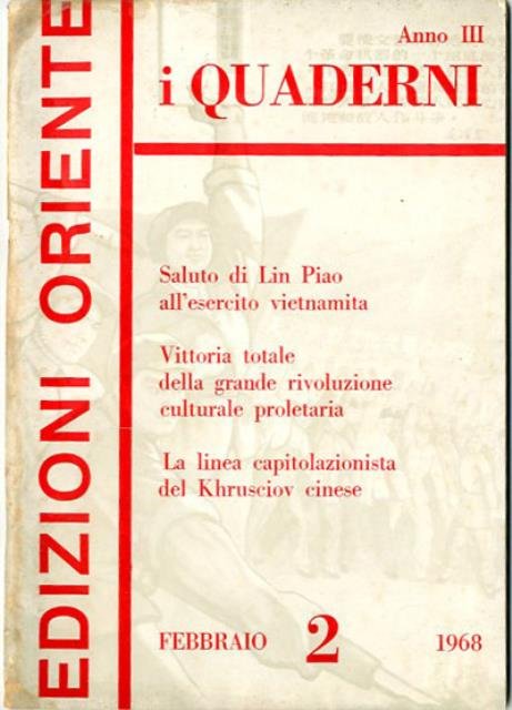 105 p. ; 24 x 17 cm. Titolo della cop.: Saluto di Lin Piao all'esercito vietnamita; Vittoria totale della grande rivoluzione culturale proletaria; la linea capitolazionista del Khrusciov cinese. Brossura editoriale, coperta a colori in carta plastificata lucida. Rilegatura a punto metallico. Codice libreria 4186.