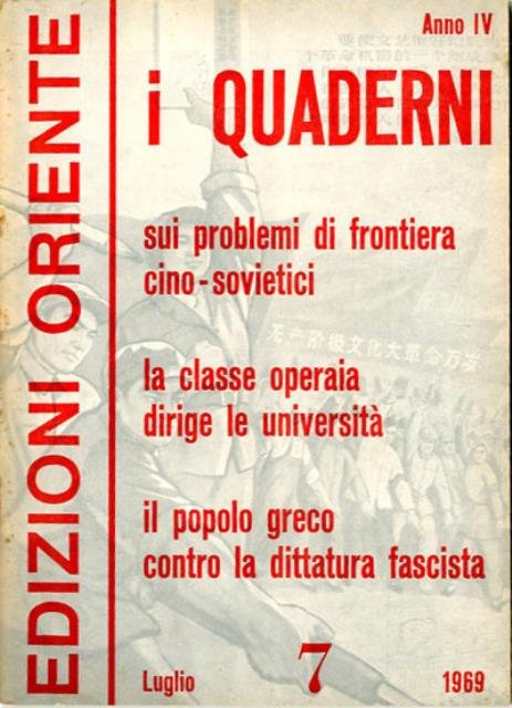 95 p. ; 24 x 17 cm. Titolo della cop.: Sui problemi di frontiera cino-sovietici; La classe operaia dirige le università; Il popolo greco contro la dittatura fascista. Brossura editoriale, coperta a colori in carta plastificata lucida. Rilegatura a punto metallico. Codice libreria 4192.