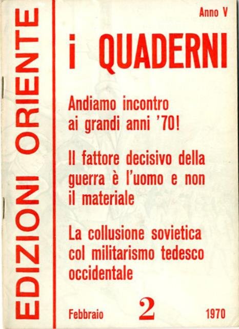 95 p. ; 24 x 17 cm. Titolo della cop.: Andiamo incontro ai grandi anni '70!; Il fattore decisivo della guerra è l'uomo e non il materiale; La collusione sovietica col militarismo tedesco occidentale. Brossura editoriale, coperta a colori in carta plastificata lucida. Rilegatura a punto metallico. Codice libreria 4197.