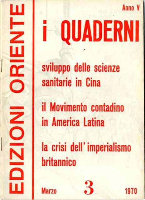 95 p. ; 24 x 17 cm. Titolo della cop.: Sviluppo delle scienze sanitarie in Cina; il movimento contadino in America Latina; La crisi dell'imperialismo britannico. Brossura editoriale, coperta a colori in carta plastificata lucida. Rilegatura a punto metallico. Codice libreria 4198.