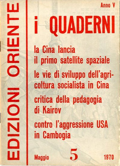 102 p. ; 24 x 17 cm. Titolo della cop.: La Cina lancia il primo satellite spaziale; Le vie di sviluppo dell'agricoltura socialista in Cina; Critica della pedagogia di Kairov; Contro l'aggressione USA in Cambogia. Brossura editoriale, coperta a colori in carta plastificata lucida. Rilegatura a punto metallico. Codice libreria 4200.