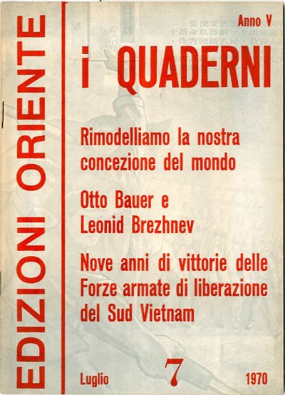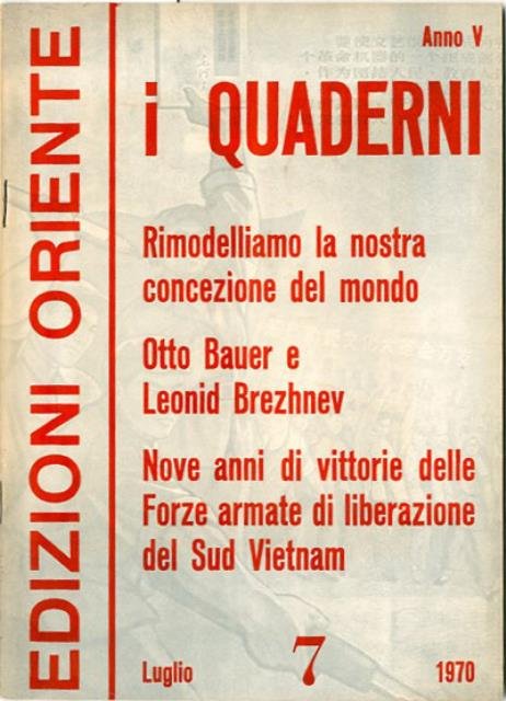 80 p. ; 24 x 17 cm. Titolo della cop.: Rimodelliamo la nostra concezione del mondo; Otto Bauer e Leonid Brezhnev; Nove anni di vittorie delle Forze armate di liberazione del Sud Vietnam. Brossura editoriale, coperta a colori in carta plastificata lucida. Rilegatura a punto metallico. Codice libreria 4202.