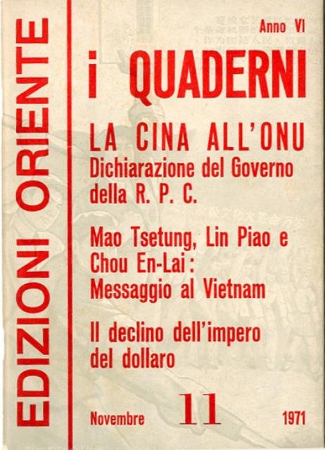 101 p. ; 24 x 17 cm. Titolo della cop.: La Cina all'ONU. Dichiarazione del Governo della R.P.C.; Mao Tse-Tung, Lin Piao e Chou En-Lai: messaggio al Vietnam; Il declino dell'impero del dollaro. Brossura editoriale, coperta a colori in carta plastificata lucida. Rilegatura a punto metallico. Codice libreria 4206.