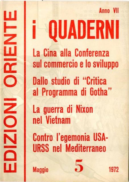 78 p. ; 24 x 17 cm. Titolo della cop.: La Cina alla Conferenza sul commercio e lo sviluppo; Dallo studio di "Critica al Programma di Gotha"; La guerra di Nixon nel Vietnam; Contro l'egemonia USA-URSS nel Mediterraneo. Brossura editoriale, coperta a colori in carta plastificata lucida. Rilegatura a punto metallico. Codice libreria 4212.
