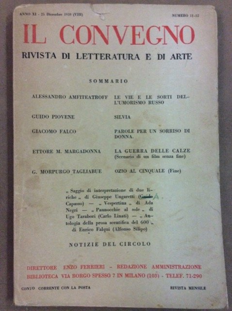 IL CONVEGNO. ANNO XI NUMERO 11 - 12. DICEMBRE 1930. - Rivista di letteratura, di arte, di idee e di libri. Dirett. E. Ferrieri.