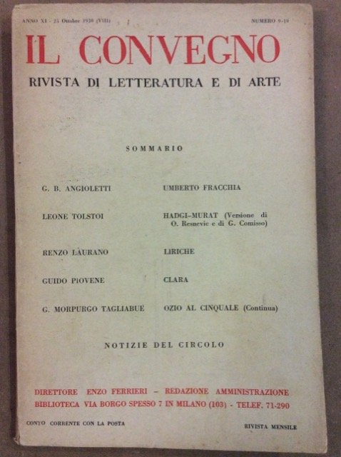 IL CONVEGNO. ANNO XI NUMERO 9 -10. OTTOBRE 1930. - Rivista di letteratura, di arte, di idee e di libri. Dirett. E. Ferrieri.