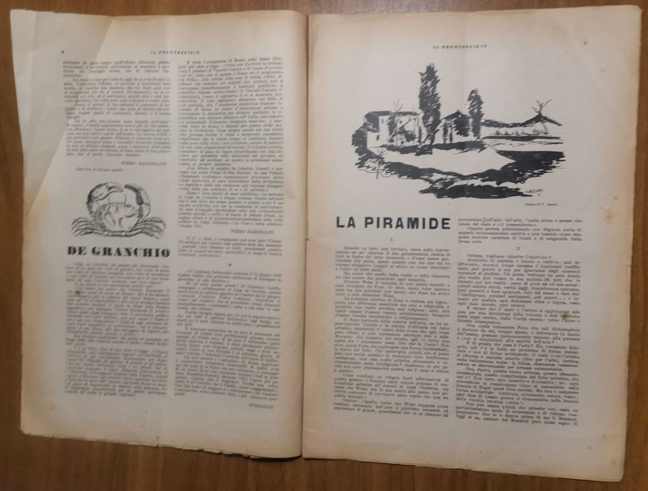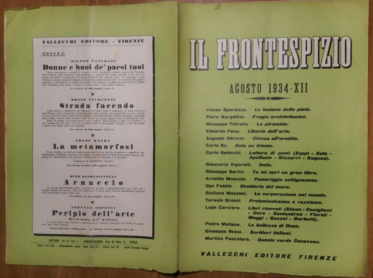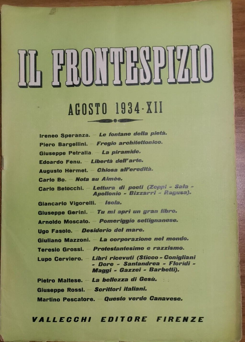 IL FRONTESPIZIO agosto 1934. Testi di Ireneo Speranza, Pietro Maltese, Carlo Bo Piero Bargellini e altri. Vallecchi Editore. Anno VI numero 8.