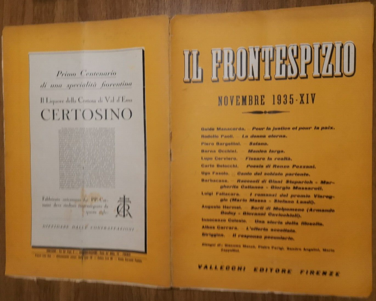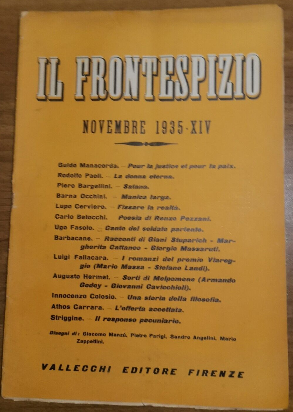 IL FRONTESPIZIO novembre 1935. Testi di Guido Manacorda, Luigi Fallacara, Ugo Fasolo, Carlo Betocchi, Piero Bargellini e altri. Disegni di Manzù Parigi e altri