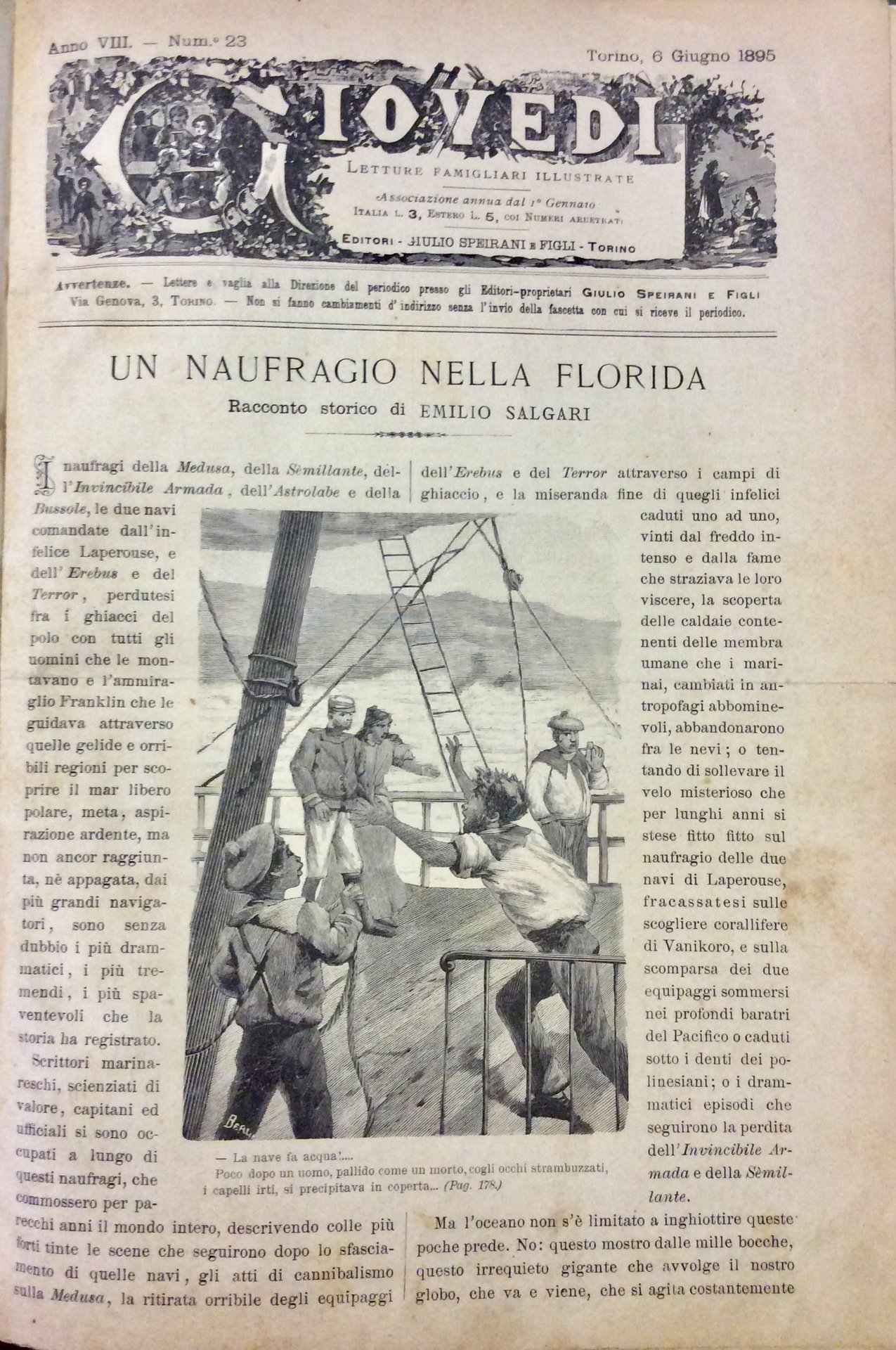 In-4 p. (mm. 285x195), cartonato moderno, titolo oro su tassello al piatto, da p. 177 a p. 224. Offriamo 6 numeri dell'Anno VIII (1895), rilegati in 1 fascicolo: nn. 23 (6/6) - 24 (13/6) - 25 (20/6) - 26 (27/6) - 27 (4/7) - 28 (11/7), che contengono Un naufragio nella Florida, racconto storico di Emilio Salgari, per la prima volta pubblicato su questo settimanale. Con lievi arross. margin. ma certamente un buon esemplare.
