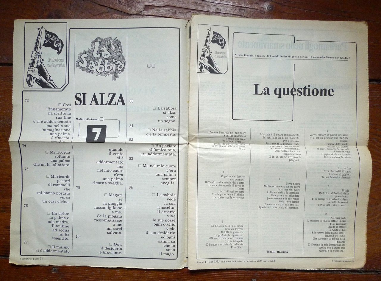 IL JAMAHIRIYA 28 marzo 1986QUOTIDIANO SETTIMANALE POLITICO, CULTURALE, ANALITICO.A cura dei Comitati rivoluzionari.Supplemento al n.15 dell'Europeo del 12 aprile 1986.Direttore responsabile: Lanfranco Vaccari.41x29,5 cm., pp.31,illustrazioni in bianco e nero,peso: g.300cod.10082CONDIZIONI DEL GIORNALE: buone,strappetti ai margini delle pagine