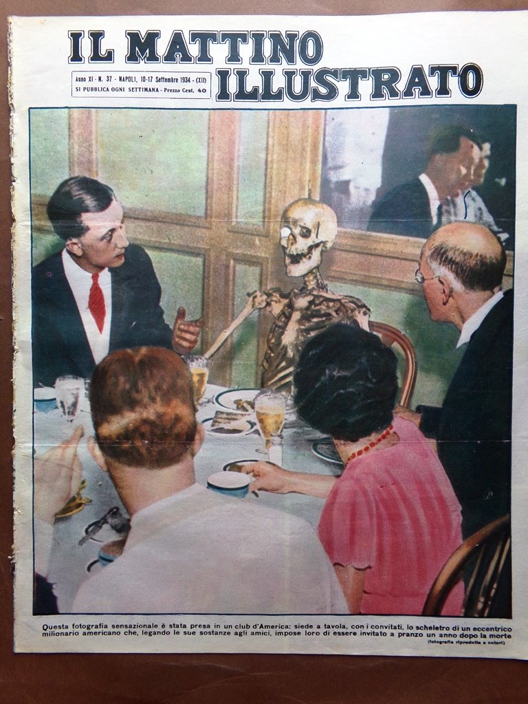 Questa fotografia sensazionale è stata presa in un Club d'America: siede a tavola, con i convitati, lo scheletro di un eccentrico milionario americano che, legando le sue sostanze agli amici, impose loro di essere invitato a pranzo un anno dopo la morte