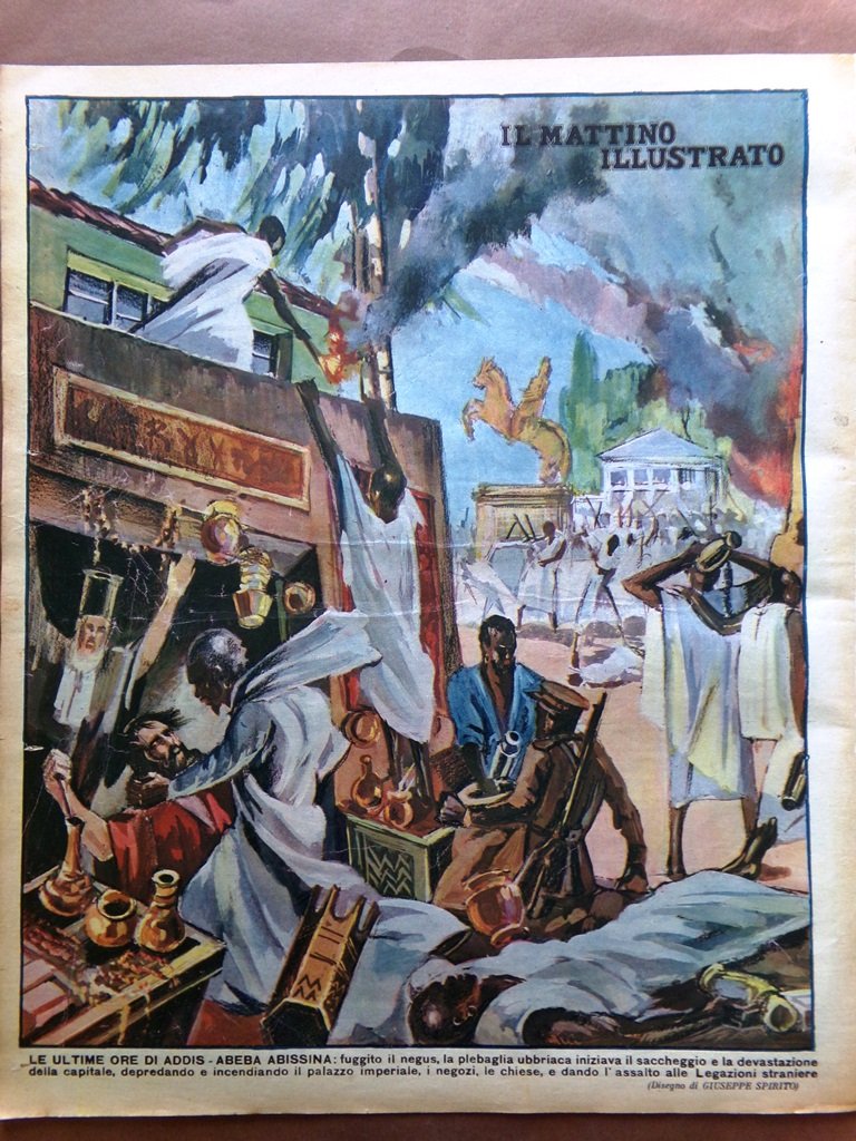 Le ultime ore di Addis Abeba abissina: fuggito il negus, la plebaglia ubriaca iniziava il saccheggio e la devastazione della capitale, depredando e incendiando il palazzo imperiale, i negozi, le chiese e dando l'assalto alle Legazioni straniere (Giuseppe Spirito)