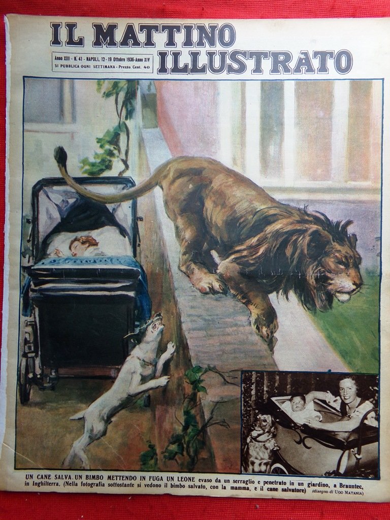 Un cane salva un bimbo mettendo in fuga un leone evaso da un serraglio e penetrato in un giardino a Brauntec, in Inghilterra (nella fotografia il bimbo salvato con la mamma e il cane) (Ugo Matania)