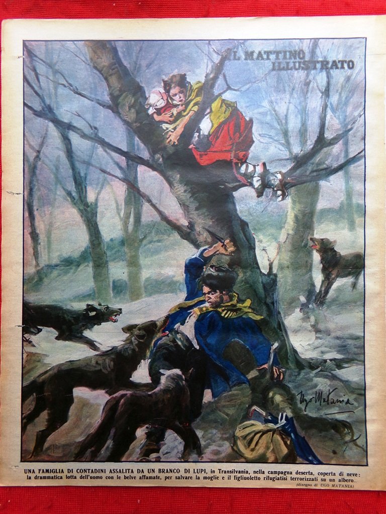 Una famiglia di contadini assalita da un branco di lupi, in Transilvania, nella campagna deserta, coperta di neve: la drammatica lotta dell'uomo con le belve affamate, per salvare la moglie e il figliuoletto rifugiatisi terrorizzati su un albero (Ugo Matania)