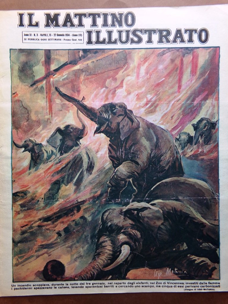 Un incendio scoppiava, durante la notte del tre gennaio, nel reparto degli elefanti, nel Zoo di Vincennes: investiti dalle fiamme i pachidermi spezzavano le catene, levando spaventosi barriti e cercando uno scampo, ma cinque di essi perivano carbonizzati (Ugo Matania)