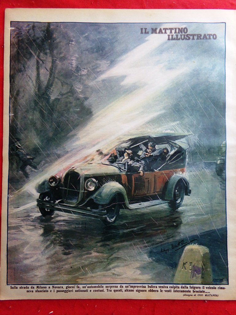 Sulla strada da Milano a Novara, giorni fa, un'automobile sorpresa da un'improvvisa bufera veniva colpita dalla folgore: il veicolo rimaneva sfasciato e i passeggeri ustionati e contusi. Tra questi, alcune signore ebbero le vesti interamente bruciate (Ugo Matania)