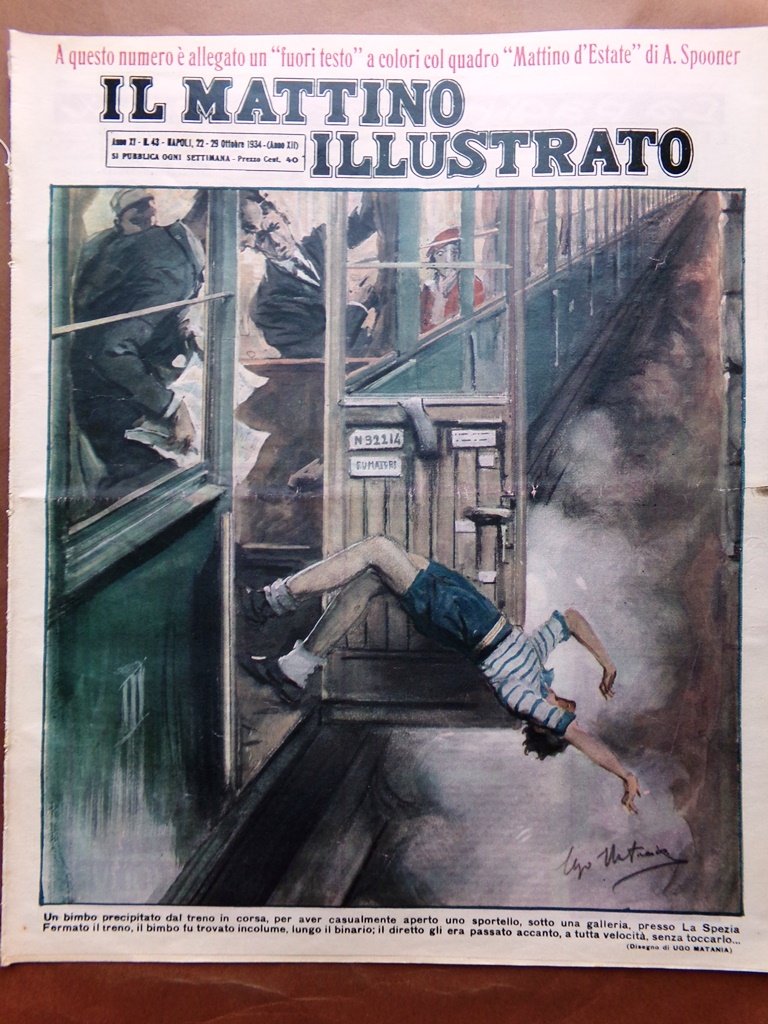 Un bimbo precipitato dal treno in corsa, per aver casualmente aperto uno sportello, sotto una galleria, presso La Spezia. Fermato il treno, il bimbo fu trovato incolume lungo il binario; il diretto gli era passato accanto, a tutta velocità, senza toccarlo (Ugo Matania)