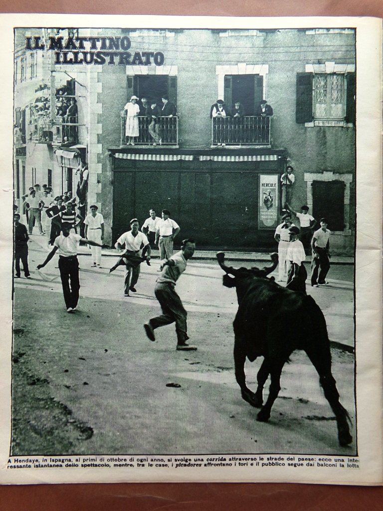 A Hendaye, in Spagna, ai primi di ottobre di ogni anno, si svolge una corrida attraverso le strade del paese: ecco una interessante istantanea dello spettacolo mentre, tra le case, i picadores, affrontano i tori e il pubblico segue dai balconi la lotta