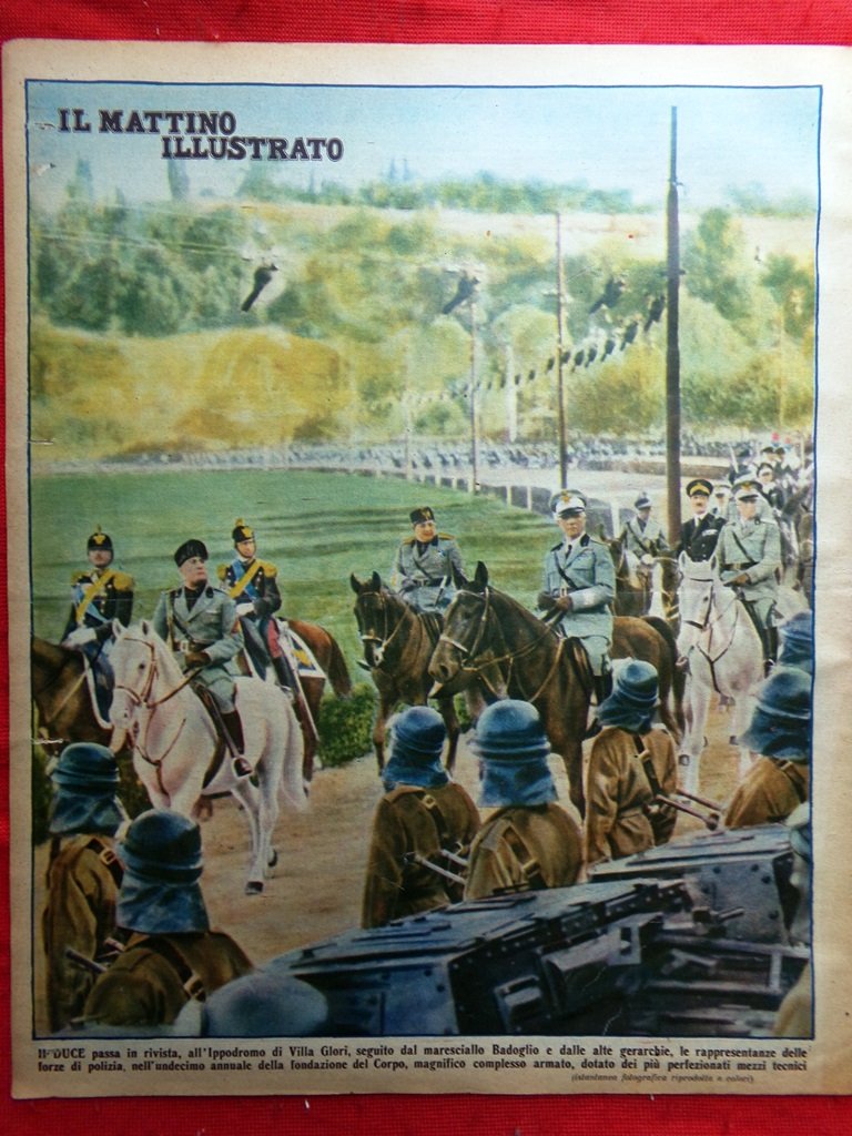 Il duce passa in rivista, all'Ippodromo di Villa Glori, seguito dal maresciallo Badoglio e dalle alte gerarchie, le rappresentanze delle forze di polizia, nell'undecimo annuale della fondazione del Corpo, magnifico complesso armato, dotato dei più perfezionati mezzi tecnici
