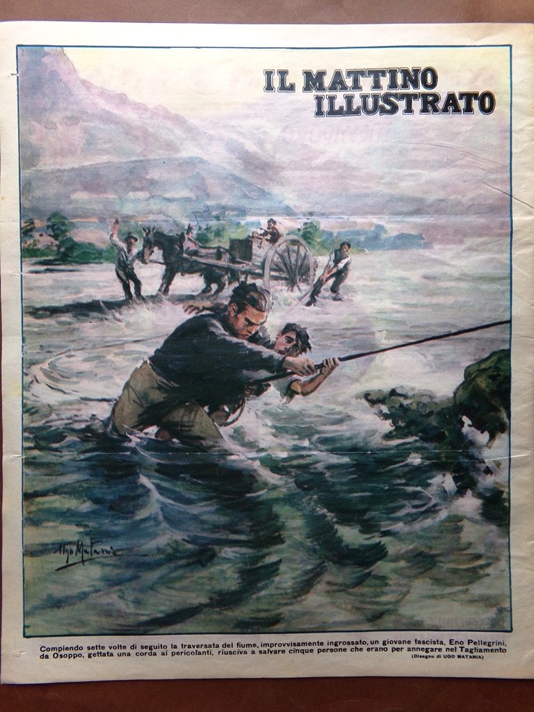 Compiendo sette volte di seguito la traversata del fiume, improvvisamente ingrossato, un giovane fascista, Eno Pellegrini, da Osoppo, gettata una corda ai pericolanti, riusciva a salvare cinque persone che erano per annegare nel Tagliamento (Ugo Matania)