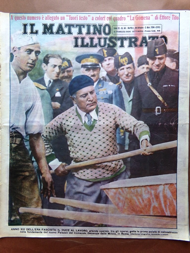 Anno XIII dell'era fascista: il Duce al lavoro, grande operaio tra gli operai, getta la prima palata di calcestruzzo nelle fondamenta del nuvoo palazzo del Comando Generale della Milizia, in Roma