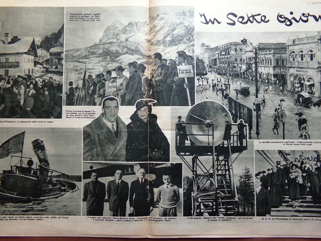 In sette giorni: Primo Carnera si sposa ? Le terribili inondazioni in India, il nuovo volo atlantico Roma-Buenos Aires, i littoriali della neve a Cortina