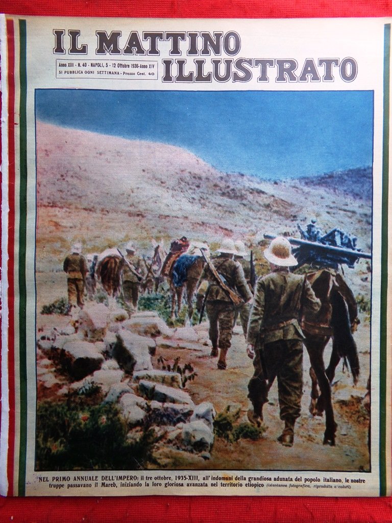 Nel primo annuale dell'impero: il tre ottobre 1935 all'indomani della grandiosa adunata del popolo italiano, le nostre truppe passavano il Mareb, iniziando la loro gloriosa avanzata nel territorio etiopico