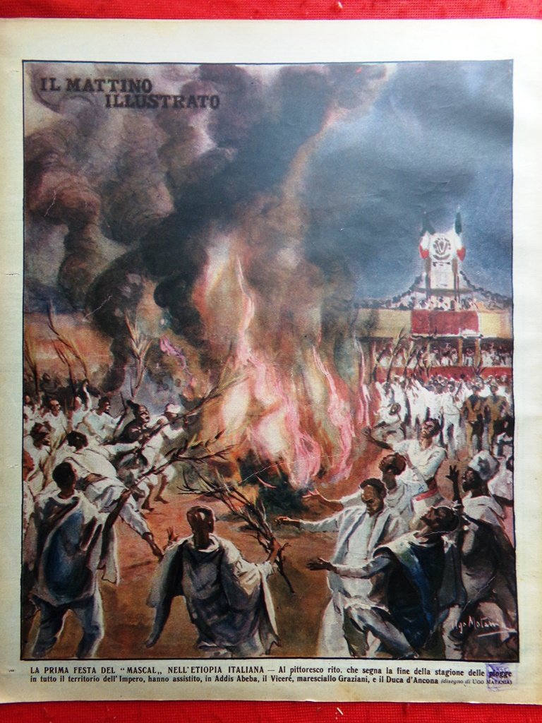 La prima festa del "Mascal" nell'Etiopia italiana: al pittoresco rito, che egna la fine della stagione delle piogge in tutto il territorio dell'Impero, hanno assistito, in Addis Abeba, il Viceré, maresciallo Graziani e il duca d'Ancona (Ugo Matania)