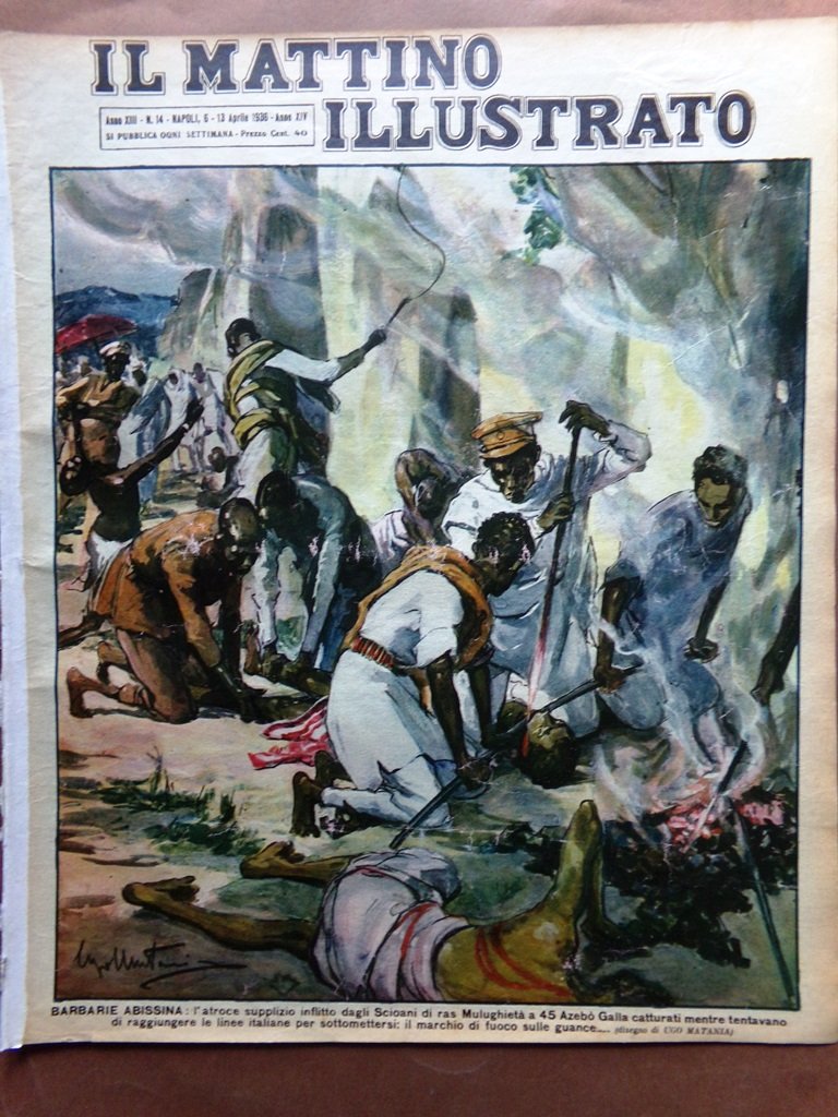 Barbarie abissina: l'atroce supplizio inflitto dagli Scioani di ras Mulughietà a 45 Azebò Galla catturati mentre tentavano di raggiungere le linee italiane per sottomettersi: il marchio di fuoco sulle guance.(Ugo Matania)