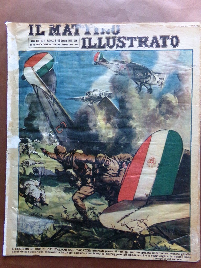 L'eroismo di due piloti italiani sul Tacazzè: atterrati presso il nemico, per un guasto improvviso, mentre gli altri aerei della squadriglia tenevano a bada gli abissini, riuscivano a distruggere gli apparecchi e a raggiungere le nostre linee (Ugo Matania)