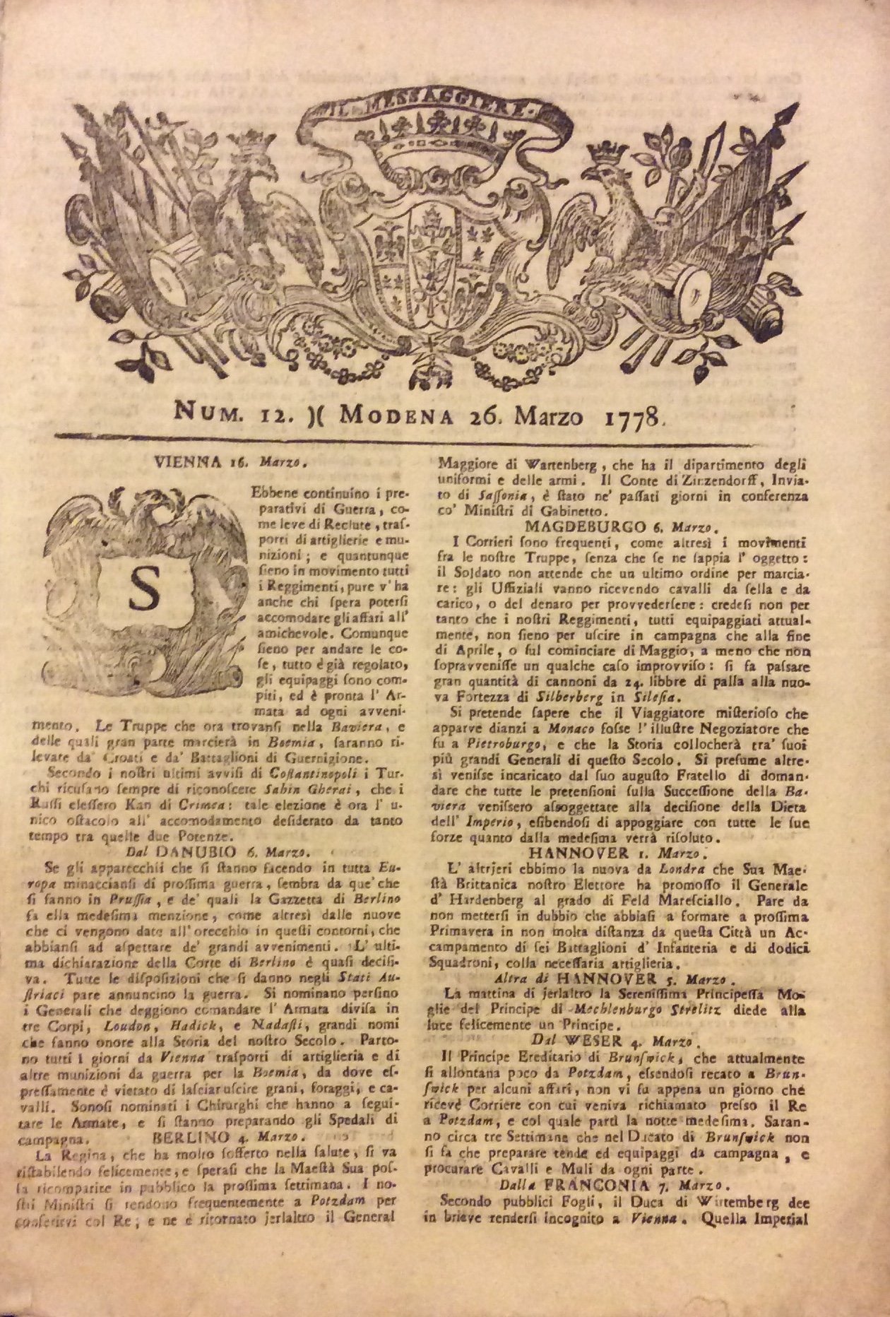 IL MESSAGGIERE - N. 12. - 26 Marzo 1778.