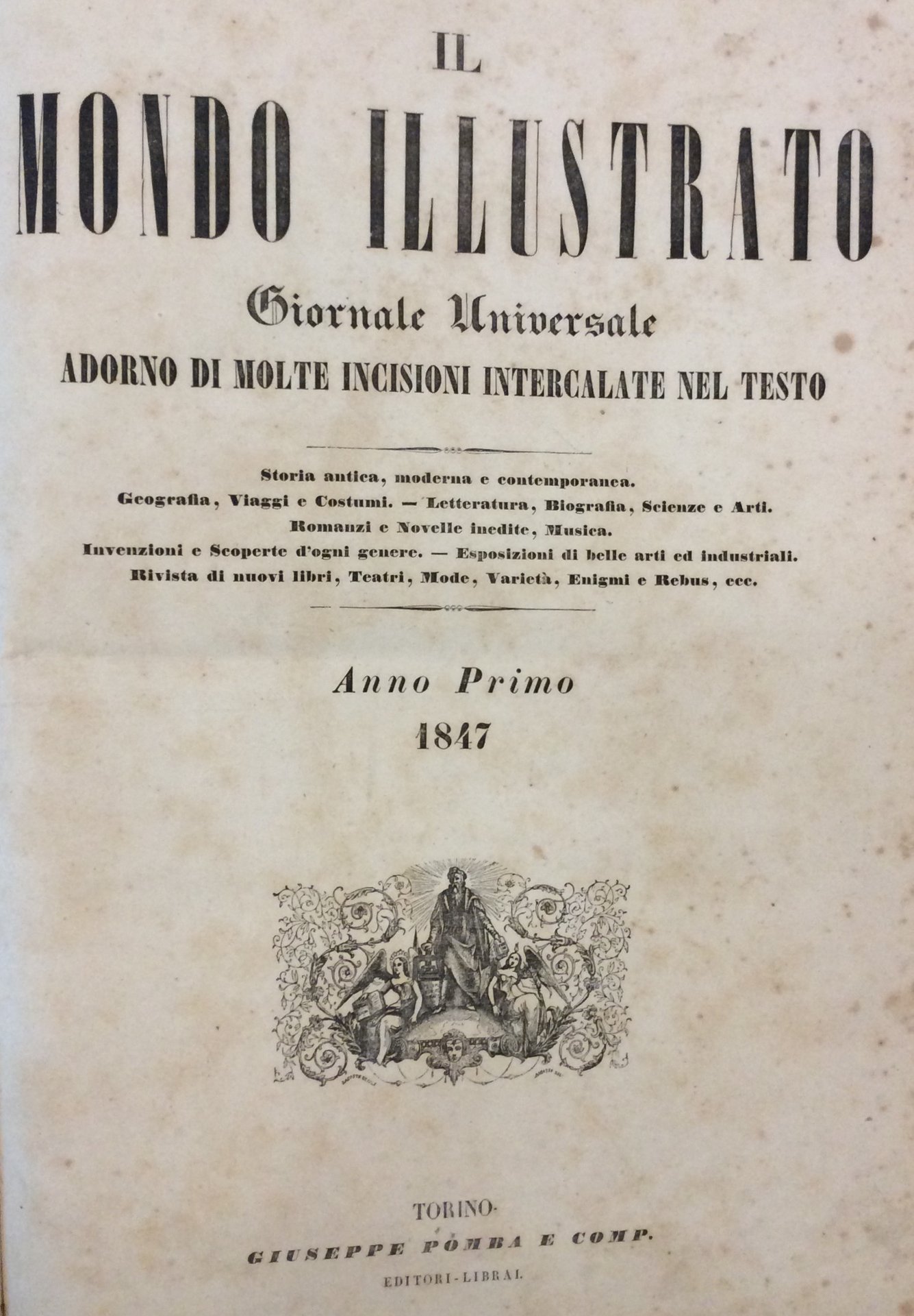 In-4 gr. (mm. 373x265), mz. pergam. con ang., fregi e titolo oro su tassello al dorso, pp. 16 cad. numero, molto ben illustr. da numerose figg. silografate nel testo Di questo celebre settimanale offriamo "la prima annata", 1847, con 51 (su 52) nn., dal n. 2, 9 gennaio al 27 dicembre + il Supplemento al n. 52 del 3 gennaio 1848. <br>E' questo il primo grande periodico illustrato per famiglie - legato all'attualità politica e culturale - apparso in Italia, sul modello dell'"Illustrated London News" e dell'"Illustration". Giuseppe Pomba riuscì a pubblicare solo le prime due annate e poi dovette chiudere per un pesante passivo. Tra i collaboratori ricordiamo: Strafforello, C. Cantù, G. Massari, R. Bonghi, ecc. e tra gli illustratori il celebre Gonin.<br>Interessante inoltre per le notizie biografiche del Conte Franc. Zambeccari che si trovano stampate sulle seguenti pagine: 615, 628, 666.Con alcune fioriture e/o arrossature altrimenti esemplare ben conservato.