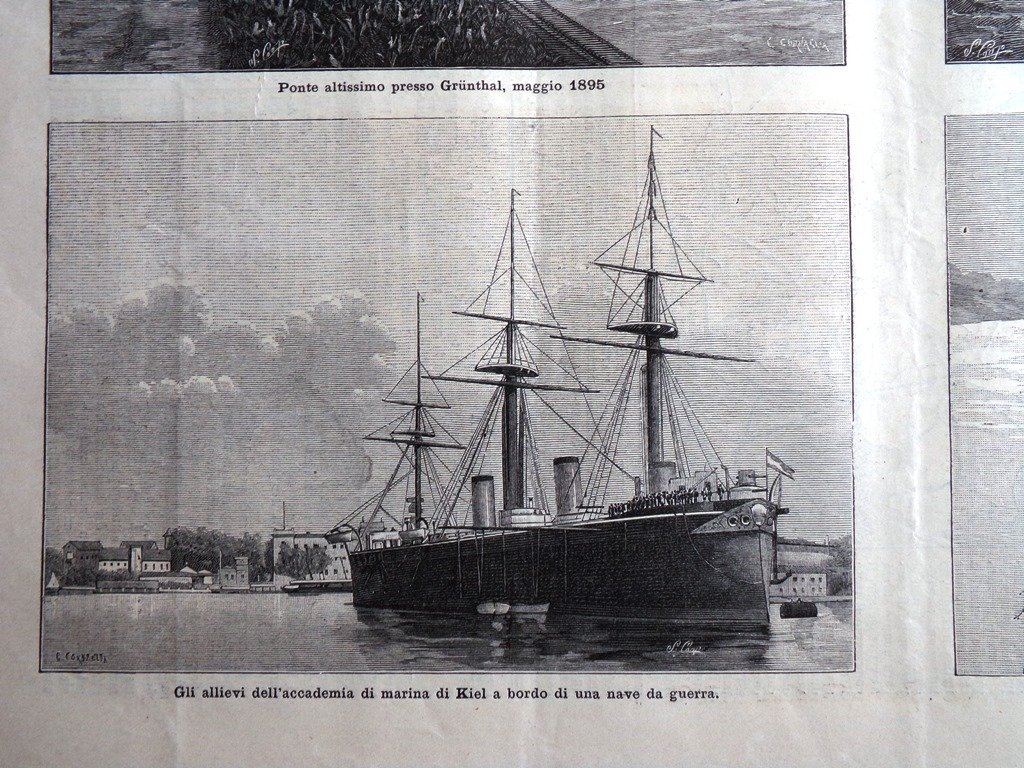 Le feste di Kiel (4 stampe in una pagina) - gli allievi dell'accademia marinara, ponte altissimo presso Grunthal, lavoratori del canale