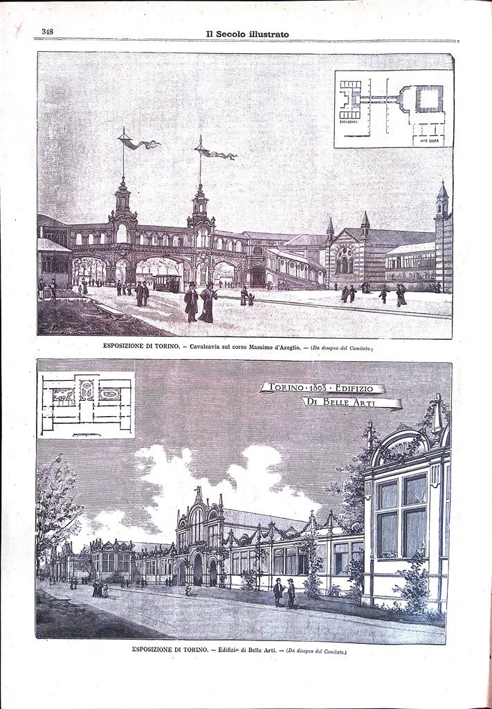 Esposizione di Torino -cavalcavia sul corso Massimo D'Azeglio, Edifizio di belle arti (2 stampe)