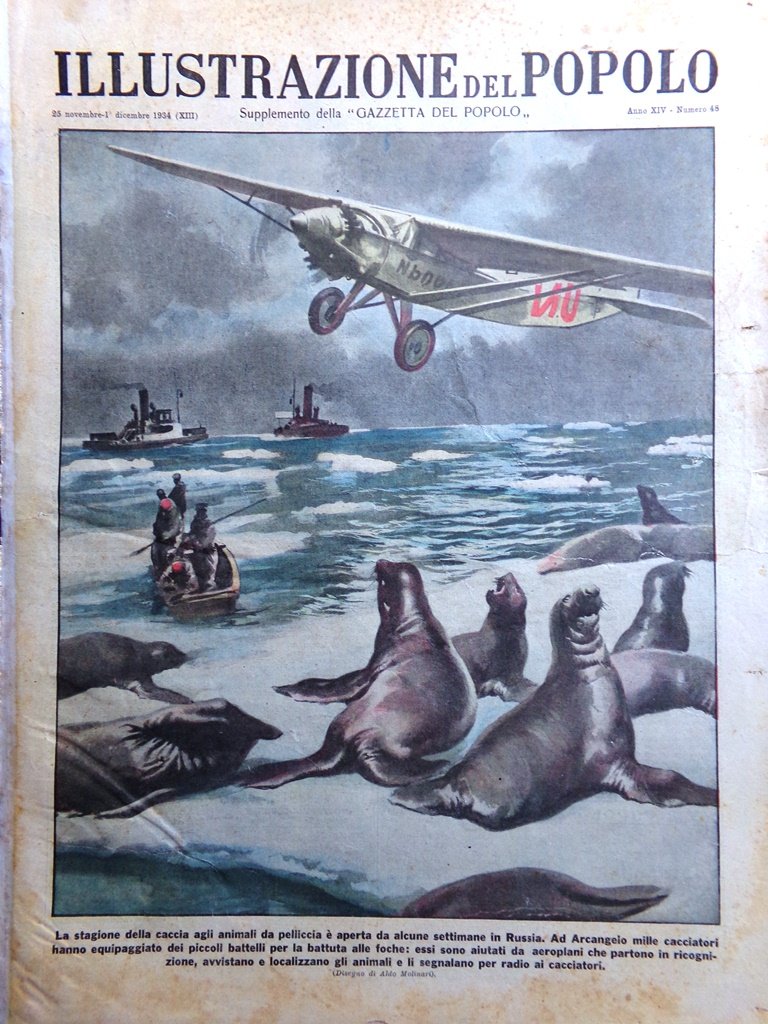 La stagione della caccia agli animali da pelliccia è aperta da alcune settimana in Russia. Ad Arcangelo mille cacciatori hanno equipaggiato dei piccoli battelli per la battuta alle foche: essi sono aiutati da aeroplani che partono in ricognizione, avvistano e localizzano gli animali e li segnalano per radio ai cacciatori (Aldo Molinari)