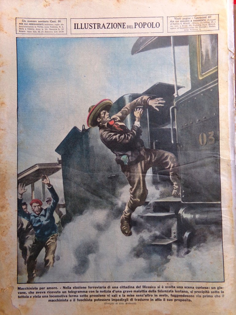 Macchinista per amore. Nella stazione ferroviaria di una cittadina del Messico si è svolta una scena curiosa: un giovane, che aveva ricevuto un telegramma con la notizia d'una grave malattia della fidanzata lontana, si precipitò sotto la tettoia e vista una locomotiva ferma sotto pressione vi salì e la mise senz'altro in moto, fuggendosene via prima che il macchinista e il fuochista potessero impedirgli di tradurre in atto il suo proposito (Aldo Molinari)