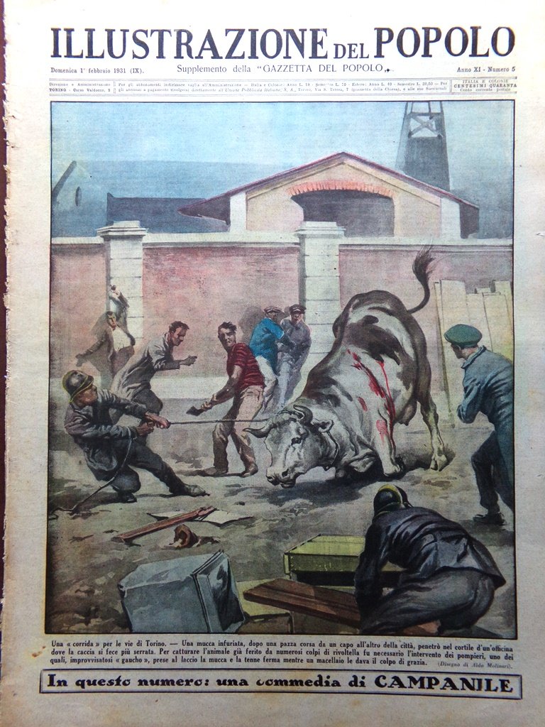 Una "corrida" per le vie di Torino. Una mucca infuriata, dopo una pazza corsa da un capo all'altro della città, penetrò nel cortile di un'officina dove la caccia si fece più serrata. Per catturare l'animale già ferito da numerosi colpi di rivoltella fu necessario l'intervento dei pompieri, uno dei quali, improvvisatosi "gaucho", prese al laccio la mucca e la tenne ferma mentre un macellaio le dava il colpo di grazia (Aldo Molinari)
