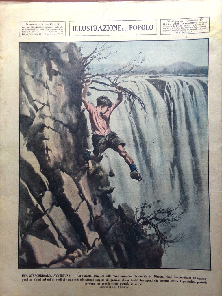 Un ragazzo, scivolato sulle rocce sovrastanti la cascata del Niagara riuscì con prontezza ad aggrapparsi ad alcuni arbusti ai quali si tenne miracolosamente sospeso sul pauroso abisso, finché due agenti che avevano scorto il gravissimo pericolo poterono con grande stento portarlo in salvo (Aldo Molinari)