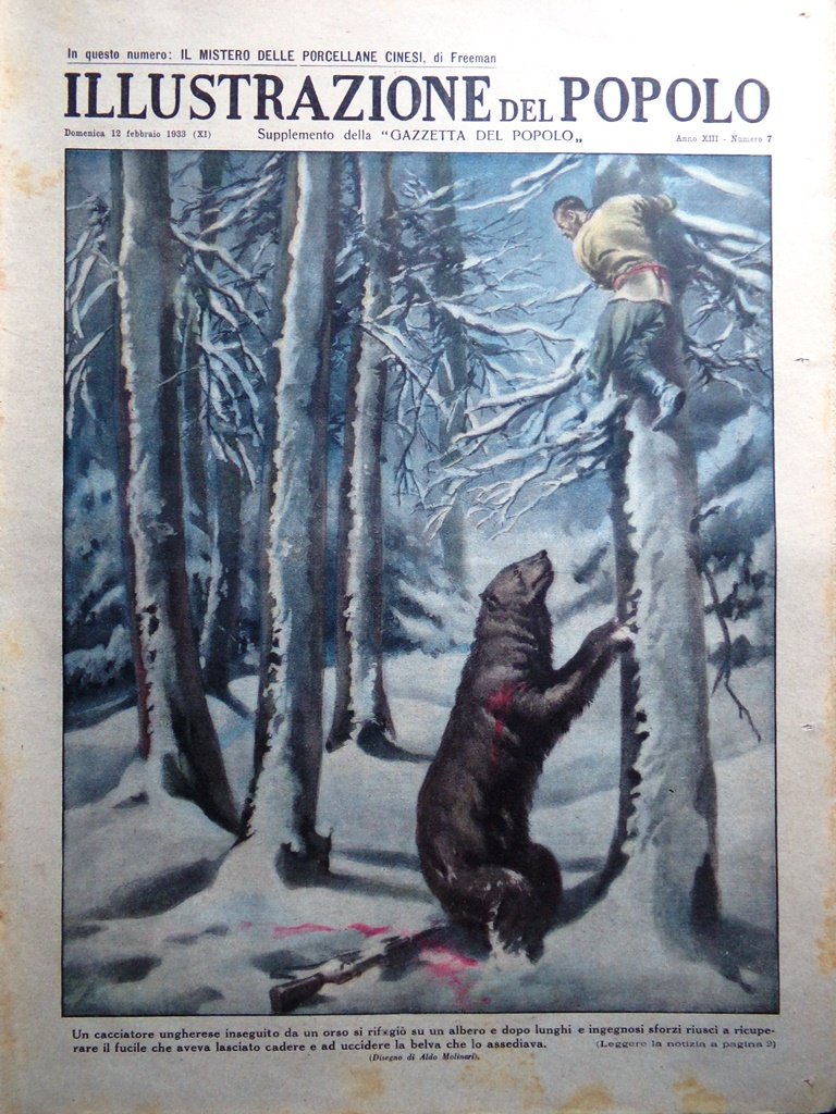 Un cacciatore ungherese inseguito da un orso si rifugiò su un albero e dopo lunghi e ingegnosi sforzi riuscì a recuperare il fucile che aveva lasciato cadere e ad uccidere la belva che lo assediava (Aldo Molinari)