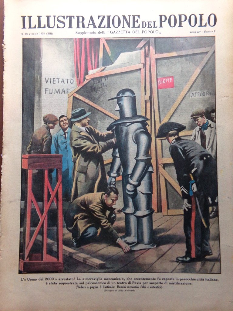 L'uomo del 2000 arrestato! La "meraviglia meccanica" che recentemente fu esposta in parecchie città italiane, è stata sequestrata sul palcoscenico di un teatro di Pavia per sospetto di mistificazione (Aldo Molinari)