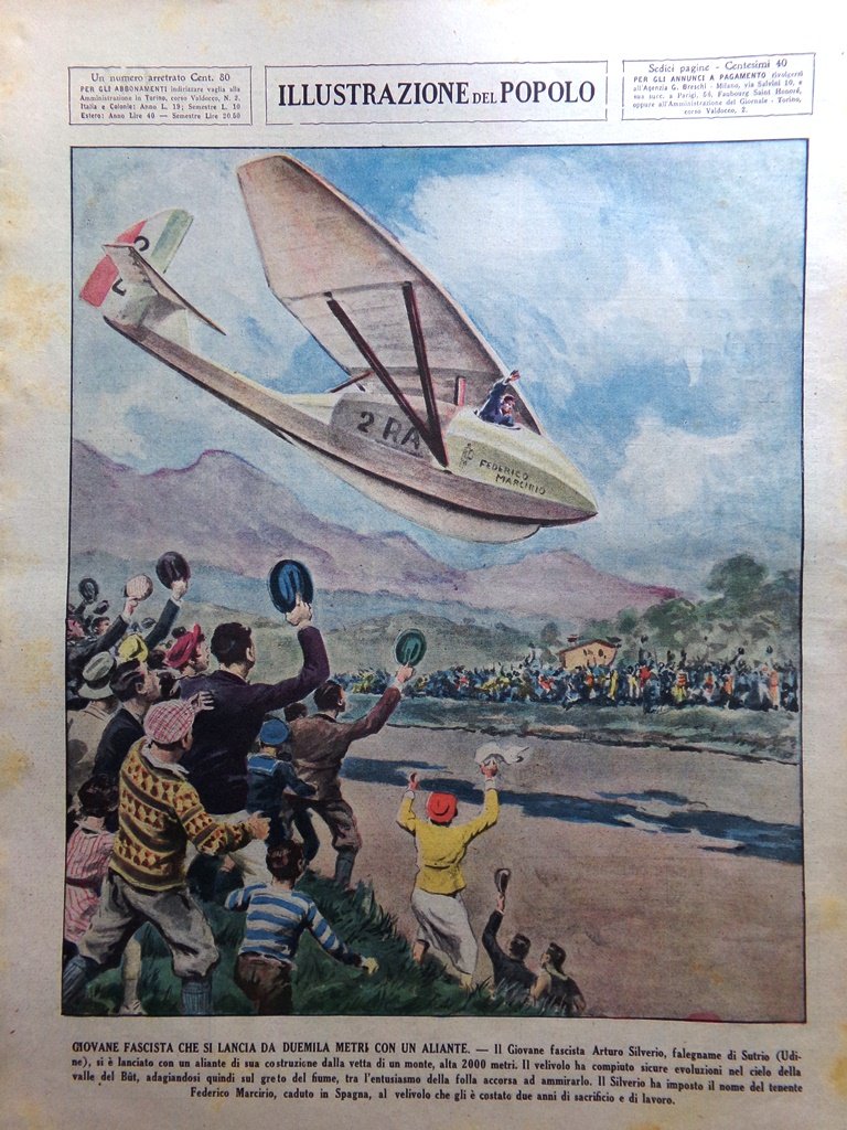 Il giovane fascista Arturo Silverio, falegname di Sutrio (Udine) si è lanciato con un aliante di sua costruzione dalla vetta di un monte, alta 2000 metri. Il velivolo ha compiuto sicure evoluzioni nel cielo della valle del But, adagiandosi quindi sul greto del fiume, tra l'entusiasmo della folla accorsa ad ammirarlo. Il Silverio ha imposto il nome del tenente Federico Marcirio, caduto in spagna, al velivolo che gli è costato due anni di sacrificio e lavoro