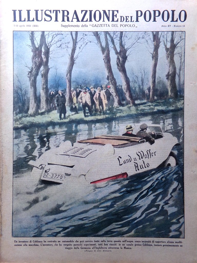 Un inventore di Coblenza ha costruito un automobile che può correre tanto sulla terra quanto nell'acqua senza necessità di apportare alcuna modificazione alla macchina. L'inventore che ha eseguito parecchi esperimenti, tutti ben riusciti in un canale presso Coblenza, tenterà prossimamente un viaggio dalla Germania all'Inghilterra attraverso la Manica (Aldo Molinari)