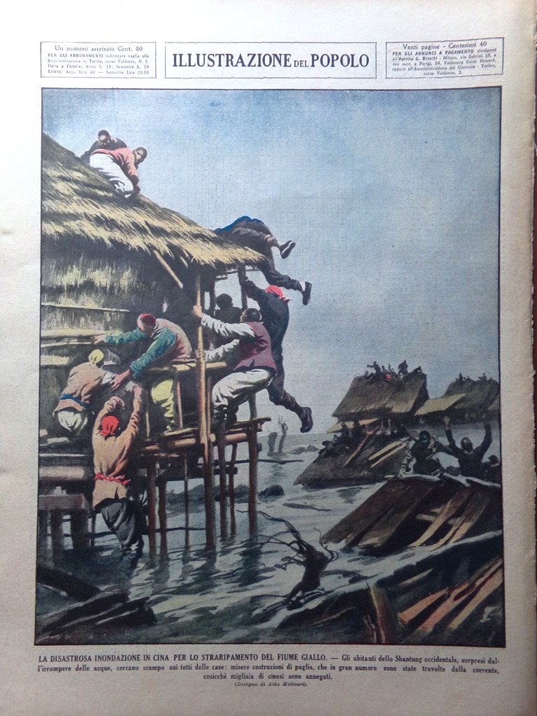 La disastrosa inondazione in Cina per lo straripamento del fiume Giallo. Gli abitanti dello Shantung occidentale, sorpresi dall'irrompere della acque, cercano scampo sui tetti delle case: misere costruzioni di paglia che in gran numero sono state travolte dalla corrente, cosicché migliaia di cinesi sono annegati (Aldo Molinari)