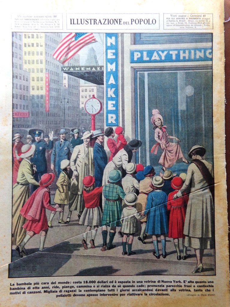 La bambola più cara del mondo: costa 18.000 dollari ed è esposta in una vetrina di New York. È alta quanto una bambina di otto anni, ride, piange, cammina e si rialza da sè quando cade; pronunzia parecchie frasi e canticchia motivi di canzoni. Migliaia di ragazzi la contemplano tutti i giorni accalcandosi davanti alla vetrina, tanto che i poliziotti devono spesso intervenire per riattivare la circolazione (Carlo Nicco)