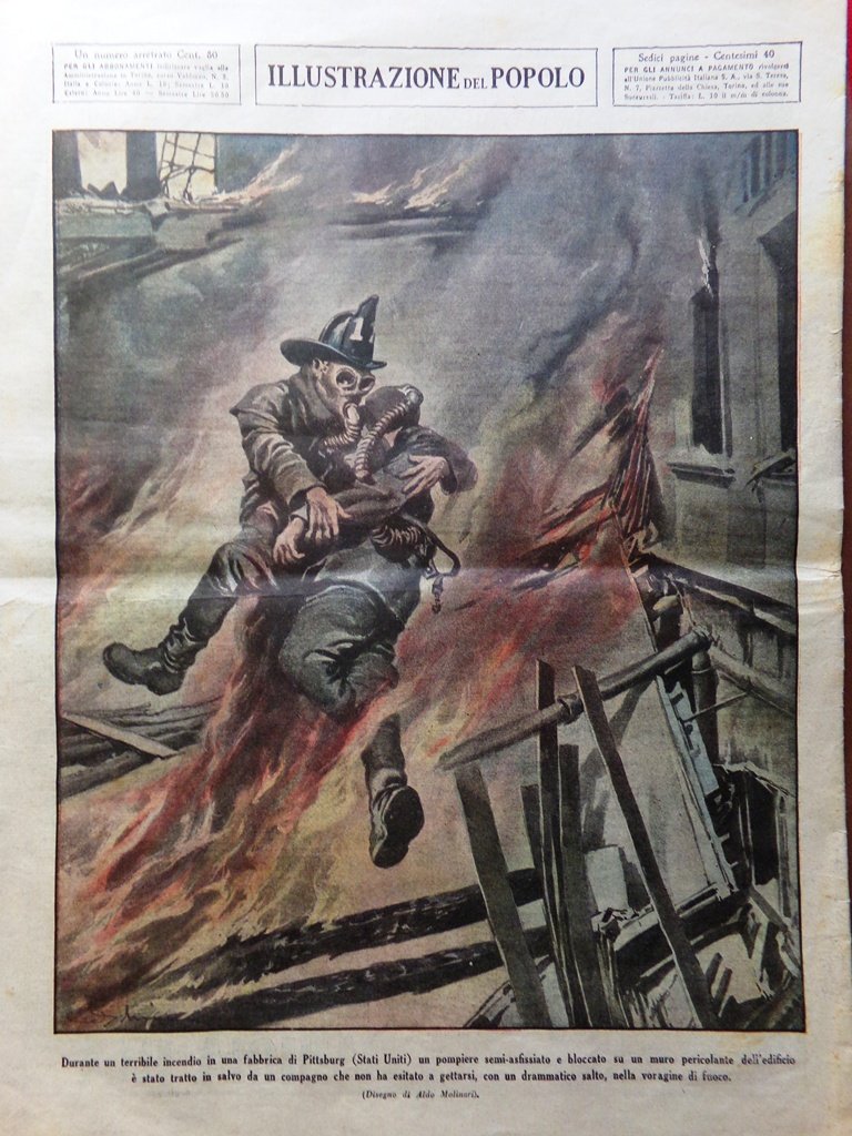 Durante un terribile incendio in una fabbrica di Pittsburg (Stati Uniti) un pompiere semi-asfissiato e bloccato su un muro pericolante dell'edificio è stato tratto in salvo da un compagno che non ha esitato a gettarsi, con un drammatico salto, nella voragine di fuoco (Aldo Molinari)