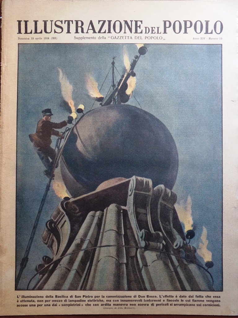 L'illuminazione della Basilica di San Pietro per la canonizzazione di Don Bosco. L'effetto è dato dal fatto che essa è ottenuta, non per mezzo di lampadine elettriche, ma con innumerevoli lanternoni e fiaccole le cui fiamme vengono accese una per una dai "sampietrini" che con ardita manovra non scevra di pericoli si arrampicano sui cornicioni (Aldo Molinari)